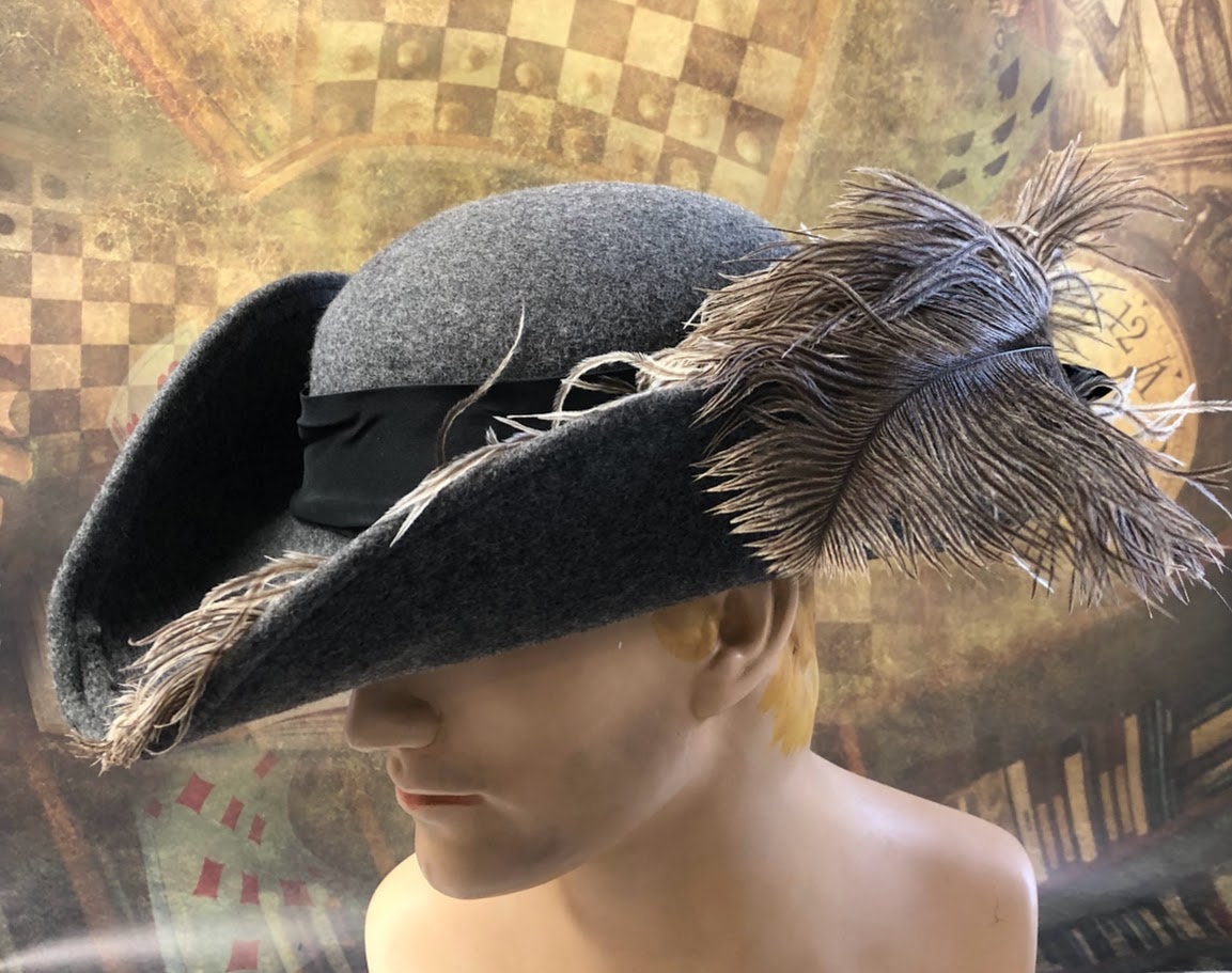 Hand-Blocked Gray Tricorn with Ostrich Feathers - In Stock ready to ship