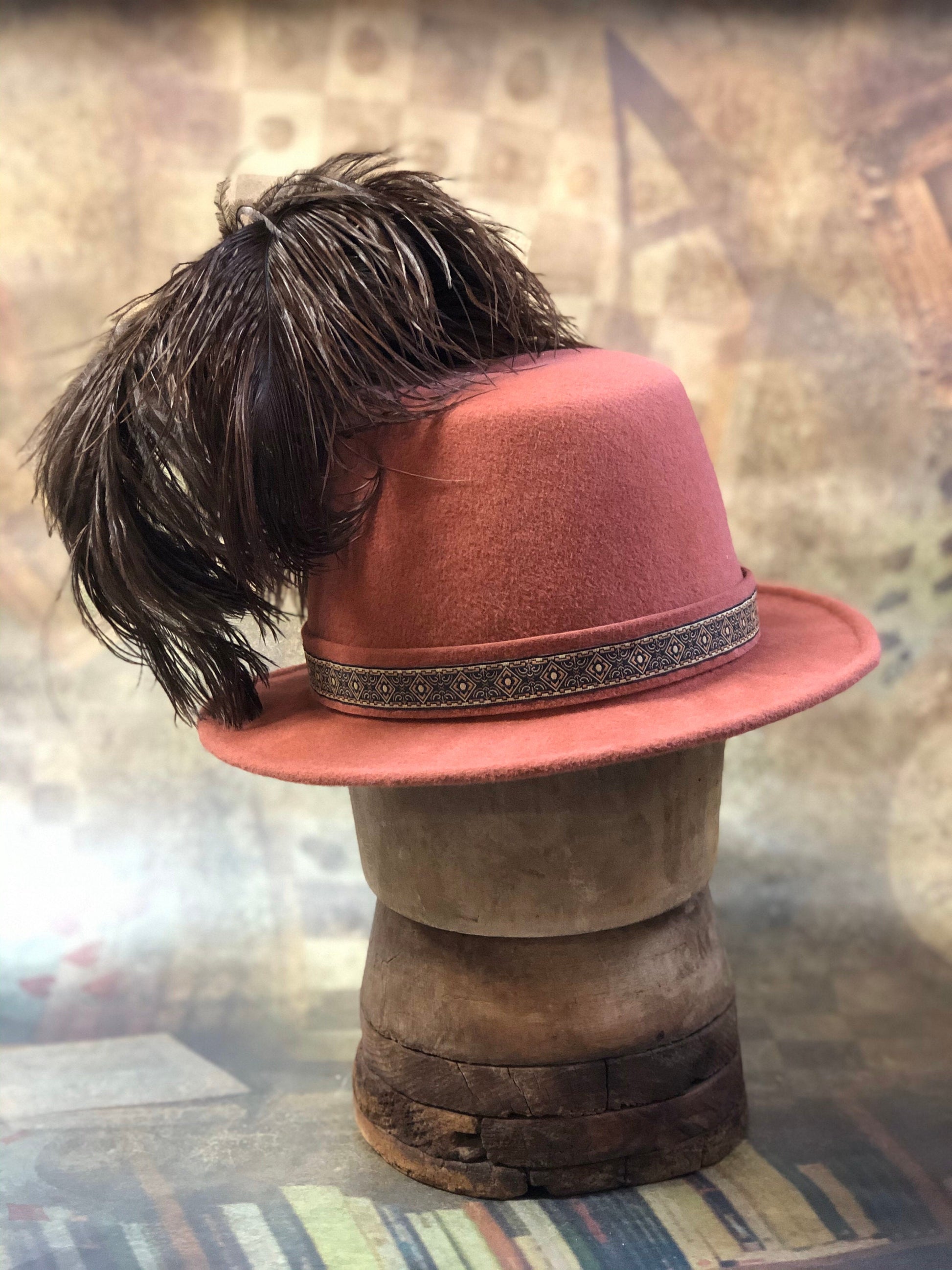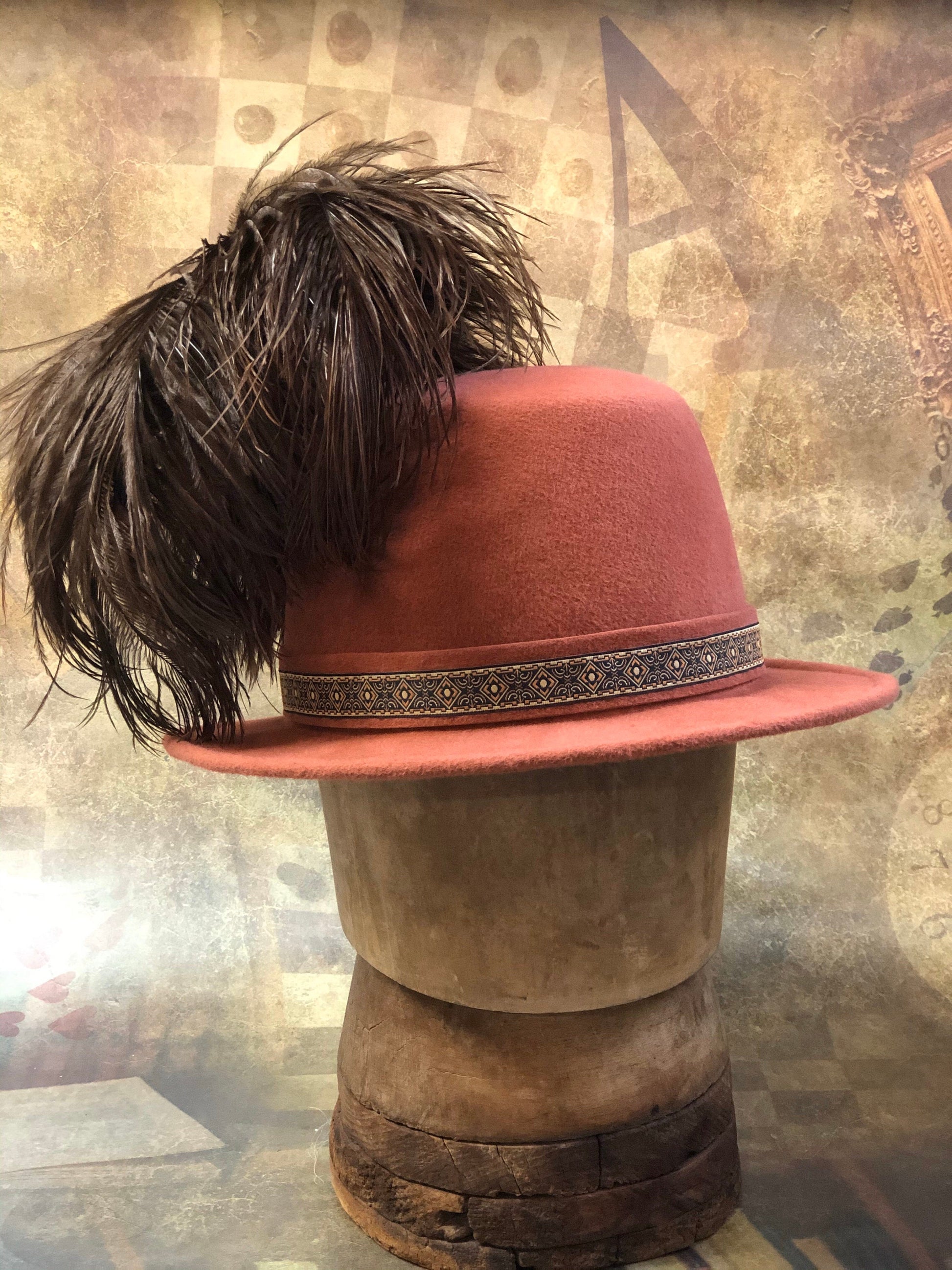 This Renaissance Flat Crown Tall Hat is a beautiful and unique piece of headwear. It is made of luxurious vintage pumpkin spice velour felt and features a layered headsize ribbon in an Elizabethan inspired geometric pattern. The hat also features a wired welt brim and a dramatic flourish of hand shaped ostrich feathers. The shape of the hat is inspired by several pieces of Elizabethan era Renaissance art from the late 1500's.