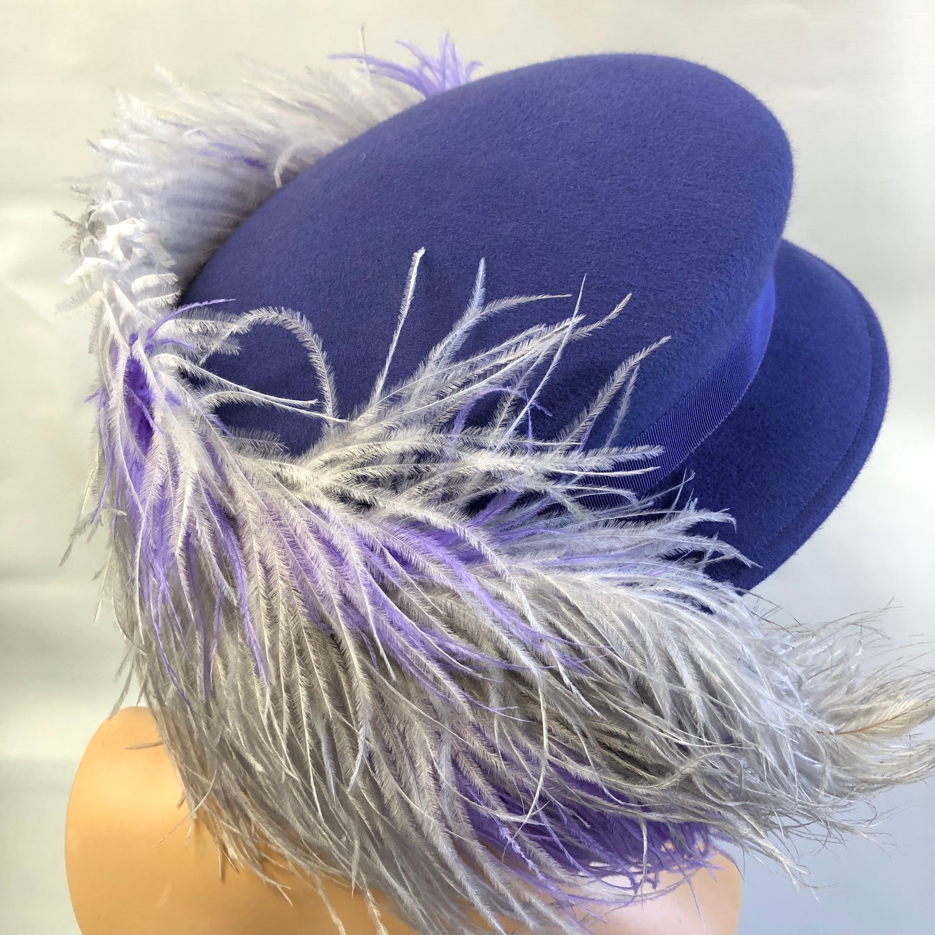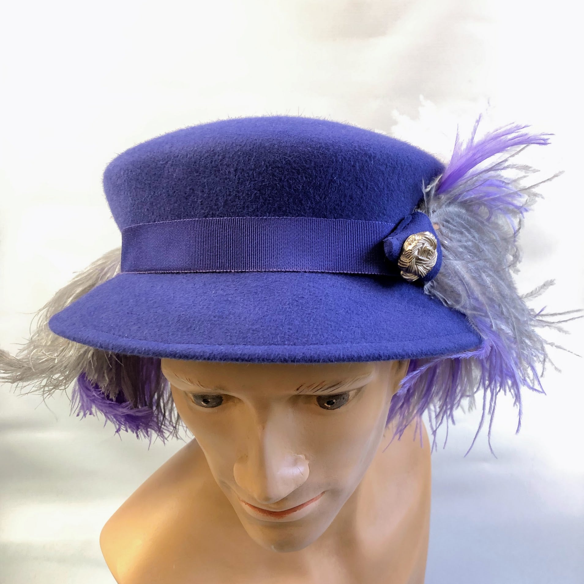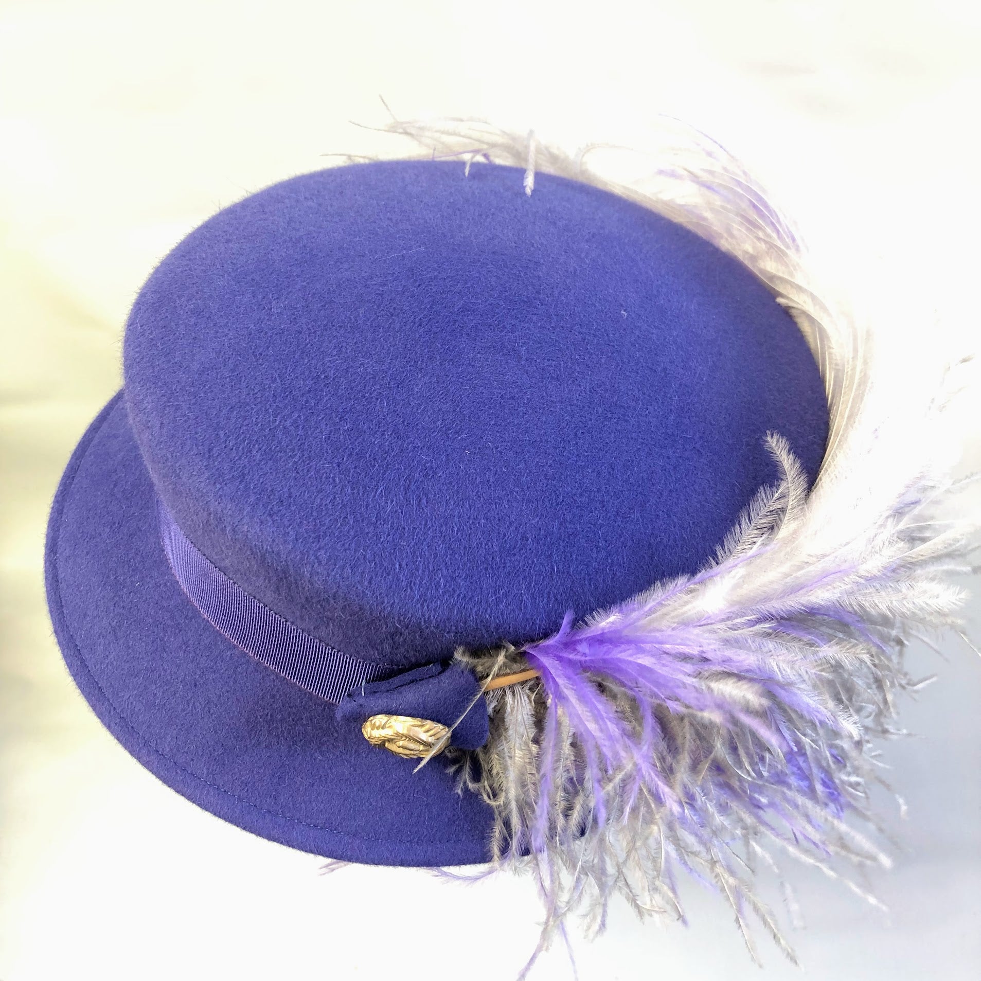 Each hat begins its journey in my studio, where premium quality felt in a striking, deep periwinkle hue is skillfully hand-blocked over traditional wooden forms. This bespoke process ensures a unique, refined shape that a machine simply cannot achieve, offering a comfortable and elegant fit.