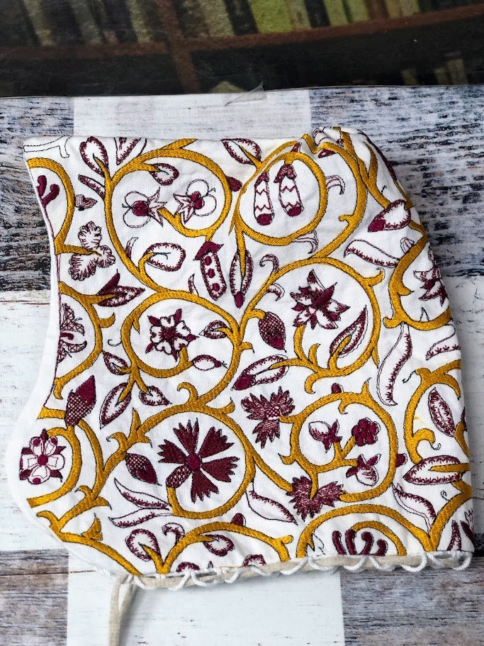 Indulge in opulence with this exquisite, hand-embroidered coif. Inspired by historic designs from the 1590s, this headpiece is a masterpiece of craftsmanship. The rich combination of gold and burgundy threads creates a captivating tapestry of scrolling vines and delicate flowers, meticulously stitched onto high-quality linen.