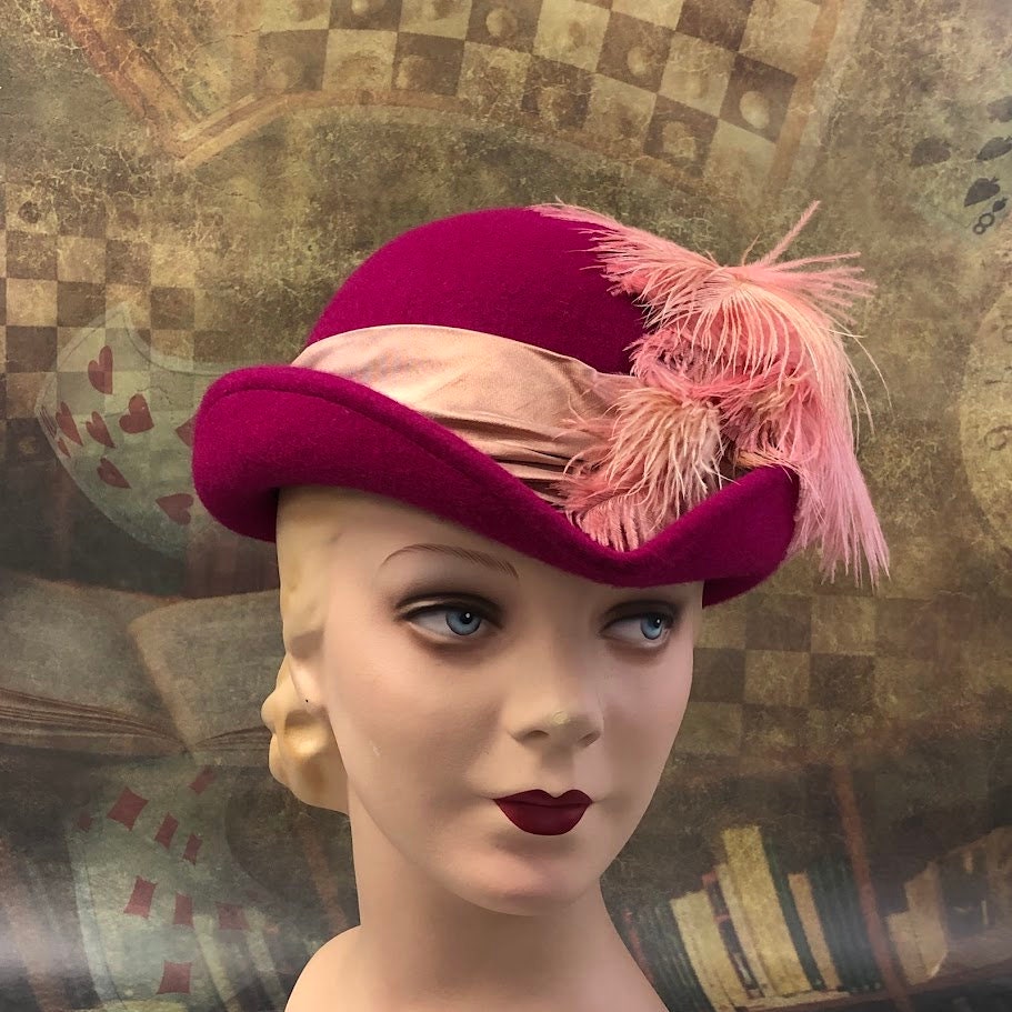 Ahoy, matey! Unleash your inner pirate with this hand-blocked tricorn hat. Crafted from luxurious magenta wool felt and shaped on a vintage wooden block, this hat is a masterpiece of craftsmanship. The dramatic dusty pink silk sash and lightly wired brim add a touch of flair, while the exuberant ostrich feathers complete the swashbuckling look.